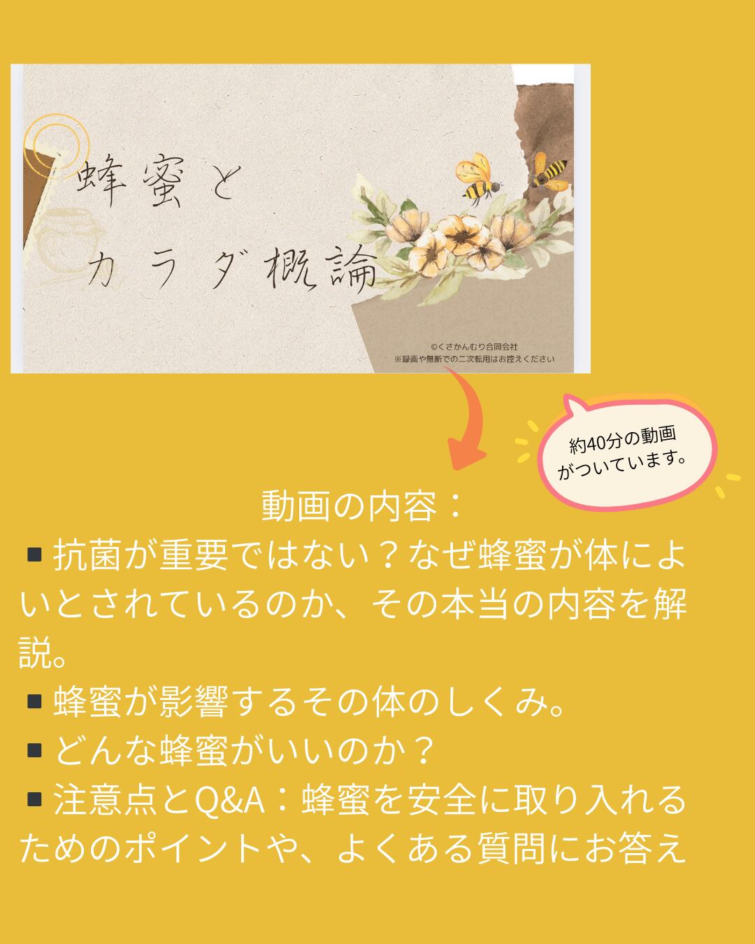 今回ご紹介するオンライン動画では、蜂蜜の正しい選び方、活用法、そしてその驚くべき健康効果をわかりやすく解説しています。動画を通して、あなたのライフスタイルに蜂蜜を無理なく取り入れる方法を学ぶことができ、体の内側から健康をサポートする知識が手に入ります。