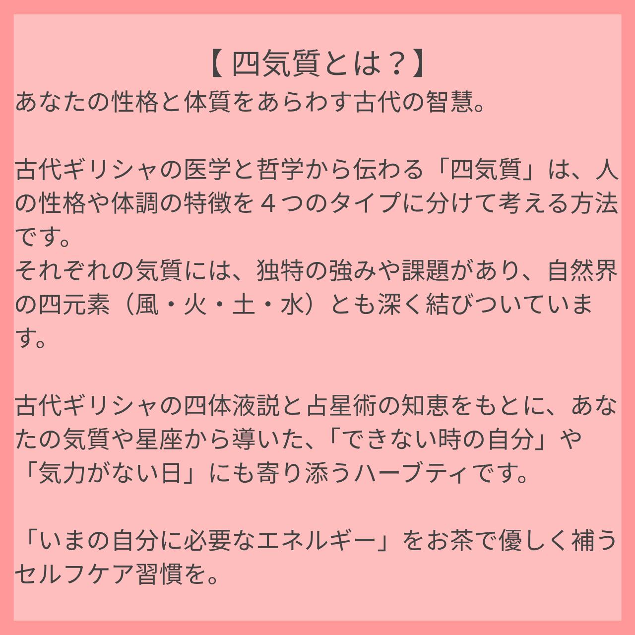 古代から伝わる「四体液説」と「四元素(火・地・風・水)」の思想をもとに、あなたの気質や星座、今の心と身体の状態に寄り添うよう設計された、
