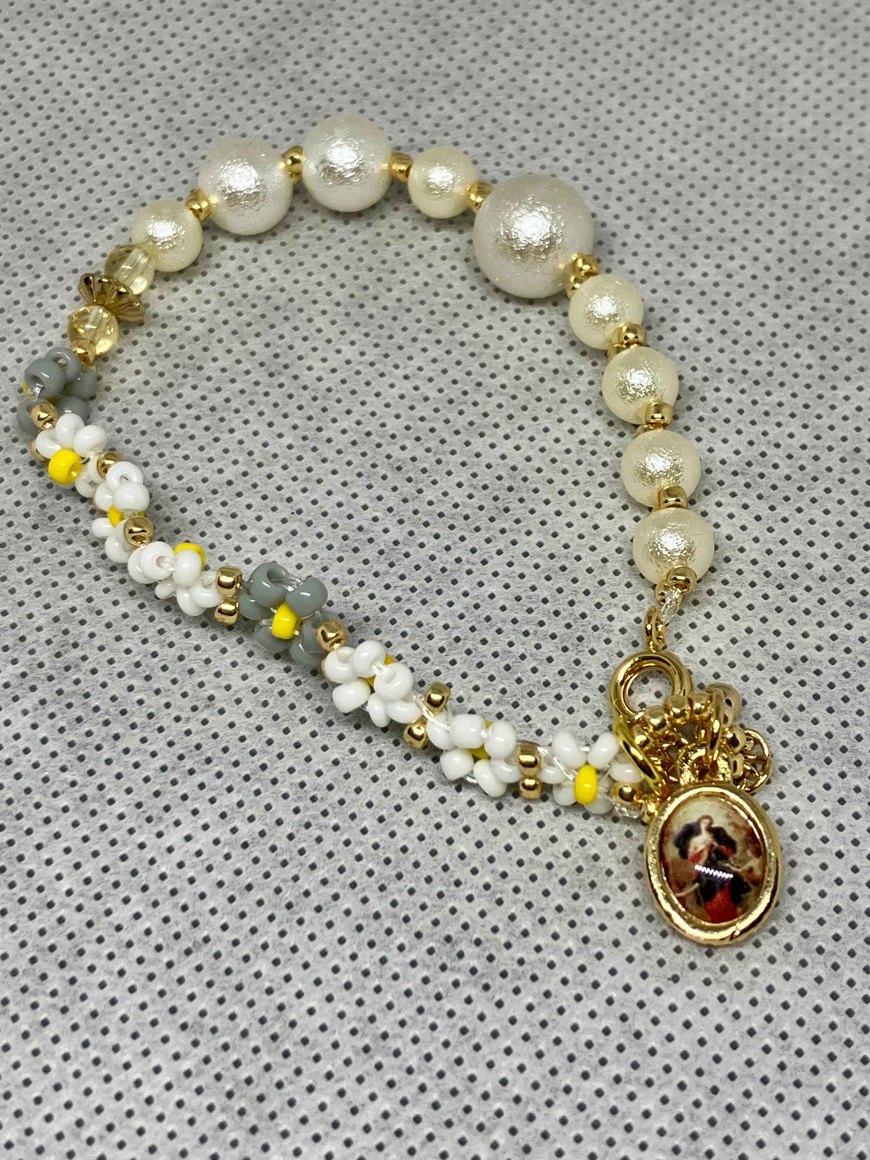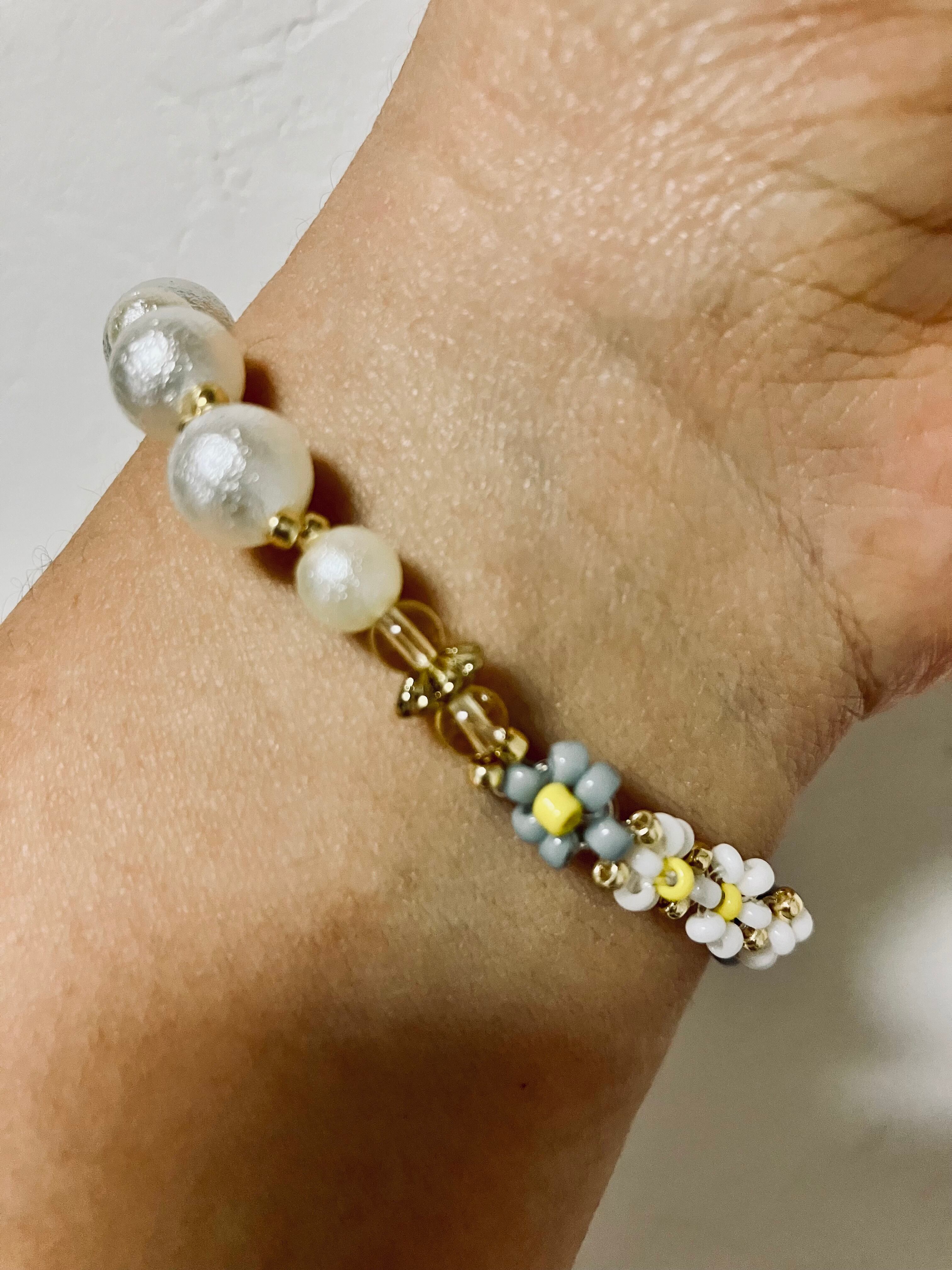 春のお花をイメージしたビーズと、コットンパールが軽やかさを運んでくれそうなブレスレットが、愉快に進んでいけそうな気持ちになります。