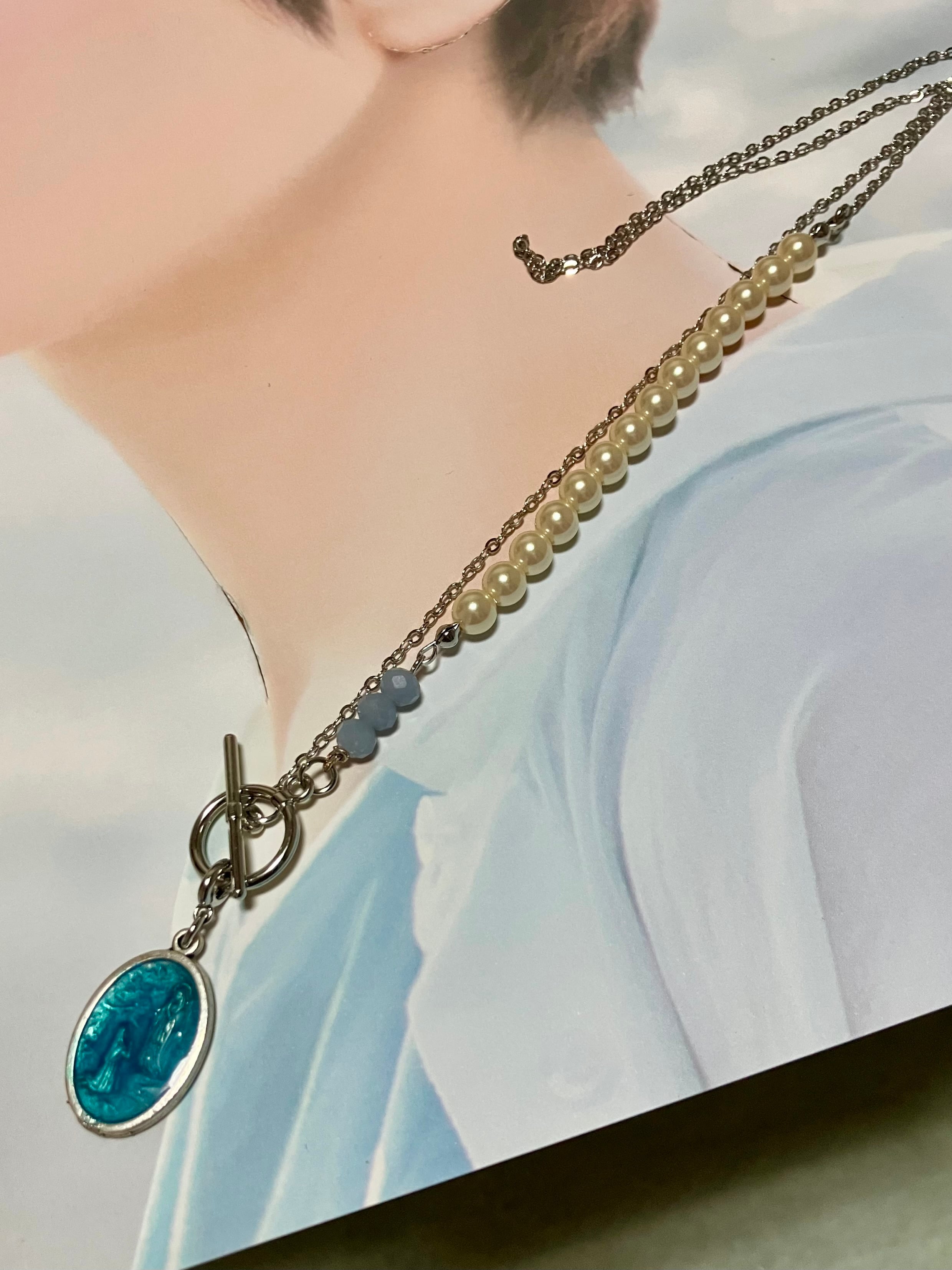 綺麗なブルーのメダイチャームは、裏も使えるリバーシブル。