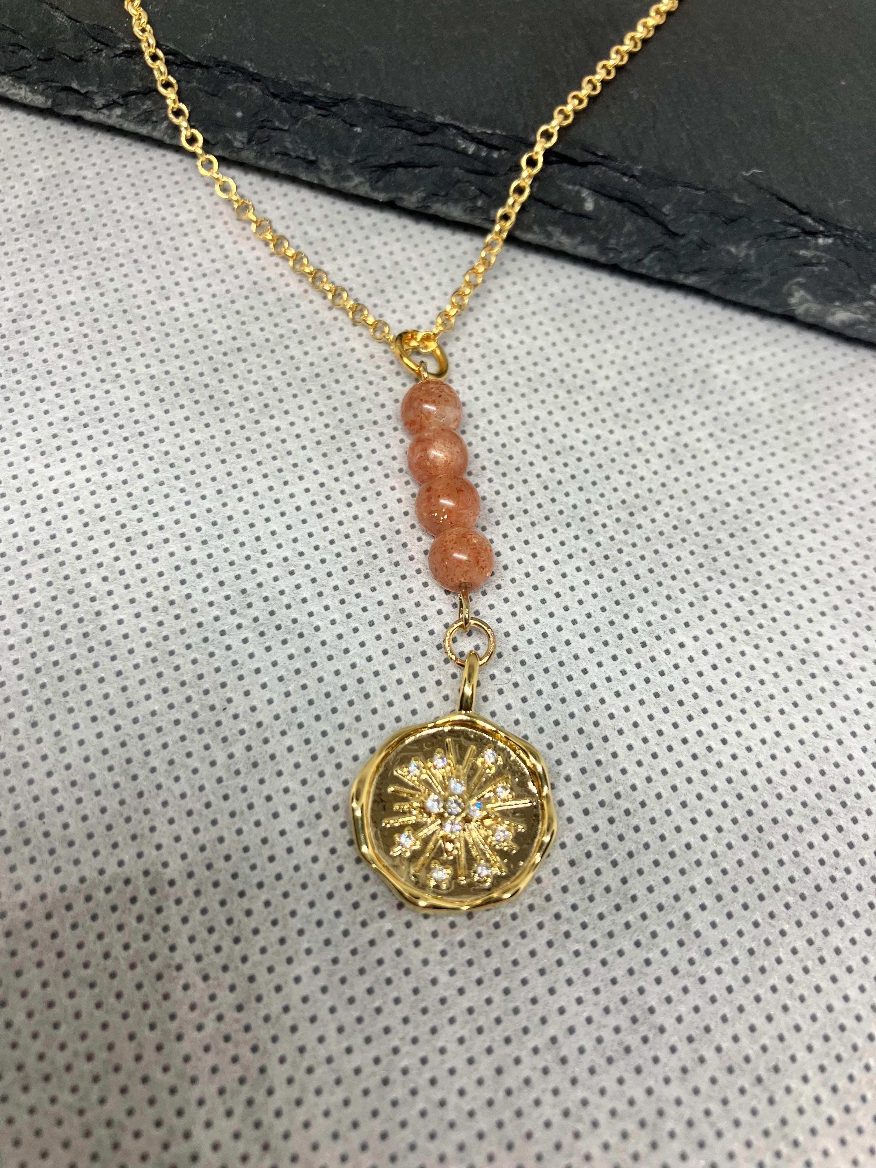 サンストーンと真ん中にキュービックジルコニアが埋め込まれたチャームがポイント。